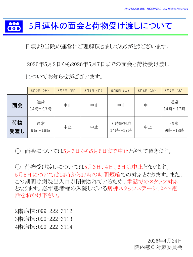 ゴールデンウイーク期間の面会・荷物対応については、